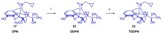 6-O-Desmethyl-6,14-ethenomorphinans was unknown until the mid-1980s. The fortuitous/serendipitous discovery by Kopcho and Schaeffer [] that the reaction of 7α-aminomethyl-6,14-ethenomorphinans with 15 equiv. LiAlH4 in THF containing CCl4 (4 equiv.) co-solvent can selectively result in the 6-O-demethylated derivatives was the first mention of this type of reaction: a selective 6-O-demethylation. Subsequently Lever et al. [] successfully extended this method for the synthesis of orvinol derivatives. 6-O-Desmethyl-buprenorphine (DBPN; see Supplementary Materials Chart S1) and 6-O-desmethyl-diprenorphine (DDPN, 22; Figure 4) are prepared and applied for the synthesis of PET precursor molecules: 3-O-tert-butyldimethylsilyl-6-O-desmethyl-diprenorphine (TBDMS-DDPN, the «Lever precursor» []; Figure 2) and 3-O-trityl-6-O-desmethy-diprenorphine (23, TDDPN, the «Luthra precursor» []; Figure 4). Despite 6-O-desmethyl-orvinols being successfully applied for the synthesis of PET precursors, their first biochemical investigations were only reported by the opioid research group of Benyhe [] at HUN-REN BRC Szeged more than three decades after the first preparation of DDPN (22; Figure 4) by Lever et al. []. The 6-O-desmethyl derivatives (DBPN, DDPN (22), DDHE, and DPEO; see structures in Supplementary Materials Chart S1) of buprenorphine (BPN), diprenorphine (DPN, 17; Figure 4), dihydroetorphine (DHE), and phenethyl-orvinol (PEO) showed higher binding affinity to μORs compared with the respective parent 6-O-methyl compounds [].