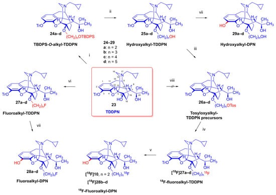 In this paper, we describe the organic synthesis of a novel type of OR ligand with fluoroalkyl and hydroxyalkyl substituents in position-6 of the 6,14-ethenomorphinan scaffold. We prepared 6-O-(fluoroalkyl)-6-O-desmethyl-diprenorphine (28a–d, (CH2)nF, n = 2–5) and 6-O-(hydroxyalkyl)-6-O-desmethyl-diprenorphine derivatives (29a–d, (CH2)nOH, n = 2–5) in multi-step synthesis processes starting from the well-known «Luthra precursor» (TDDPN, 23) []. Furthermore, we synthesized the corresponding 3-O-trityl-6-O-(tosyloxyalkyl)-6-O-desmethyl-diprenorphine precursors (26a–d) for the direct nucleophilic radiosynthesis of 6-O-([18F]fluoroalkyl)-6-O-desmethyl-diprenorphine ([18F]28a–d, (CH2)nF, n = 2–5) derivatives. We also performed in silico docking analyses of 6-O-(fluoroalkyl)- and 6-O-(hydroxyalkyl)-diprenorphine derivatives (n = 2–5), together with further 6,14-ethenomorphinans and another relevant OR ligands.