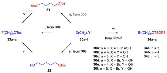 Tosyloxyalkyl precursor molecules (26a–d) for direct nucleophilic one-pot, two-step nucleophilic radiofluorination for 6-O-([18F]fluoroalkyl)-6-O-desmethyl-diprenorphines ([18F]28a–d) were synthesized in a three-step procedure. The direct introduction of the tosyloxyalkyl side chain into position-6 by reacting TDDPN (23) with bistosyloxy alkanes (TosO(CH2)nOTos, n = 2–5) proved unfeasible in our hands [], yielding undesired heterocyclic products. Consequently, we reverted to our previous strategy [,] for introduction of the desired tosyloxyalkyl side chain at the 6-O-position in three consecutive reaction steps (route: 24a–d → 25a–d → 26a–d). First, the «Luthra» precursor (TDDPN, 23) was alkylated with 2.3 equiv. of the corresponding tert-butyldiphenysilyl (TBDPS)-protected bromoalkanol (34a–c, Br(CH2)nOTBDPS, n = 3–5; Figure 6) in DMF in the presence of 10 equiv. sodium hydride to yield 6-O-(tert-butyldiphenylsilyloxy-alkyl)-6-O-desmethyl-3-O-trityl-diprenorphine derivatives (24a–d), with yield in a range of 40–71%. TBDPS-protected bromoalkanols (34a–c; Figure 6) were synthesized from the corresponding bromoalkanols (30d–f) with tert-butyldiphenylsilyl chloride (TBDPSCl) in dichloromethane in the presence of DMAP and DIPEA. Subsequently the TBDPS protecting group of compounds 24a–d was removed by treatment with 1.28 equiv. of 1M tetrabutylammonium fluoride in THF (RT, argon, 4 h) to give 6-O-(hydroxyalkyl)-6-O-desmethyl-3-O-trityl-diprenorphines (25a–d), with 84–93% yield.
