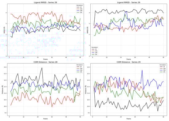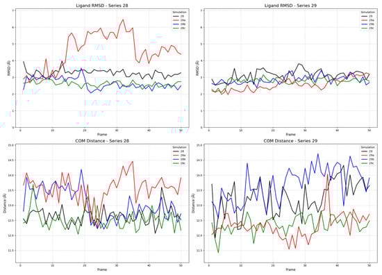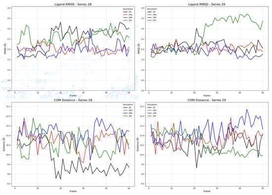 To investigate the binding dynamics and conformational stability of ligands from series 28 (28a–d) and series 29 (29a–d), we conducted multiple molecular dynamics (MD) simulations for each compound in complex with the receptor in its active, inactive, and partial agonist-bound conformations. The stability of the ligand–receptor complexes was assessed by monitoring two key metrics throughout the simulation trajectories: the root mean square deviation (RMSD) of the ligands’ heavy atoms and the center of mass (COM) distance between the ligand’s and the receptor’s binding sites. The ligand RMSD was calculated with respect to its initial docked pose after a rotational and translational fit to the receptor’s backbone, providing a quantitative measure of the ligand’s conformational stability within the binding pocket. A low, equilibrated RMSD value is indicative of a stable binding mode, whereas high or continuously increasing values suggest significant conformational changes or instability []. The COM distance was measured between the geometric centers of the ligand and a defined set of binding site residues. This metric evaluates the ligand’s positional stability; a stable COM distance signifies that the ligand remains localized, while large fluctuations can indicate movement within the pocket or dissociation events [].