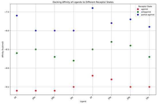 To complement the dynamic analysis from MD simulations, we first assessed the static binding predictions from molecular docking. The calculated binding affinities (in kcal/mol) for each ligand across the three receptor states—agonist (active), antagonist (inactive), and partial agonist—are presented in Figure 10. The results reveal a clear and consistent energetic hierarchy. Altogether, all compounds show a distinct preference for the active receptor state, which yielded the most favorable binding affinities for every ligand tested. In the active state, scores were consistently around −9.5 kcal/mol, with series 28 ligands showing slightly more favorable energies than those in series 29. Within series 29, a trend was observed where ligands with longer chains achieved somewhat better scores. A similar pattern was observed for the inactive state, which showed intermediate affinities of approximately −8.5 kcal/mol. Similarly, series 28 was slightly better than series 29, and longer chains again appeared to confer a modest energetic advantage. The partial agonist state consistently produced the least favorable scores, ranging from −7.5 to −8.0 kcal/mol, yet the same structural trends persisted: series 28 ligands docked more favorably than series 29, and longer-chained compounds were preferred. This overarching trend indicates that even in a static model, all ligands are energetically predisposed to bind most favorably to the fully active receptor conformation. This provides an initial, static validation for the state-selective behavior observed in the more detailed molecular dynamics simulations.
