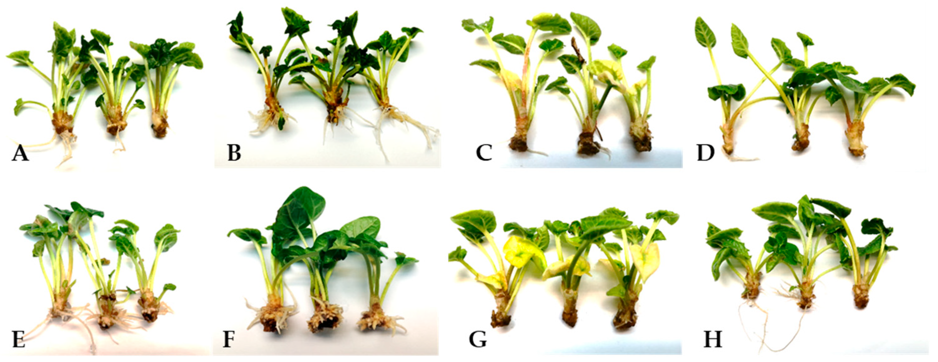 For in vitro experiments, 30 shoots (5 shoots × 6 glass jars) were used in each treatment. The experiments were carried out twice. The final data were the means of two replicated experiments. The data were subjected to a one-factor and two-factor analysis of variance using STATISTICA software (v. 13.3). Duncan’s test was performed to evaluate the significance of differences at p ≤ 0.05.