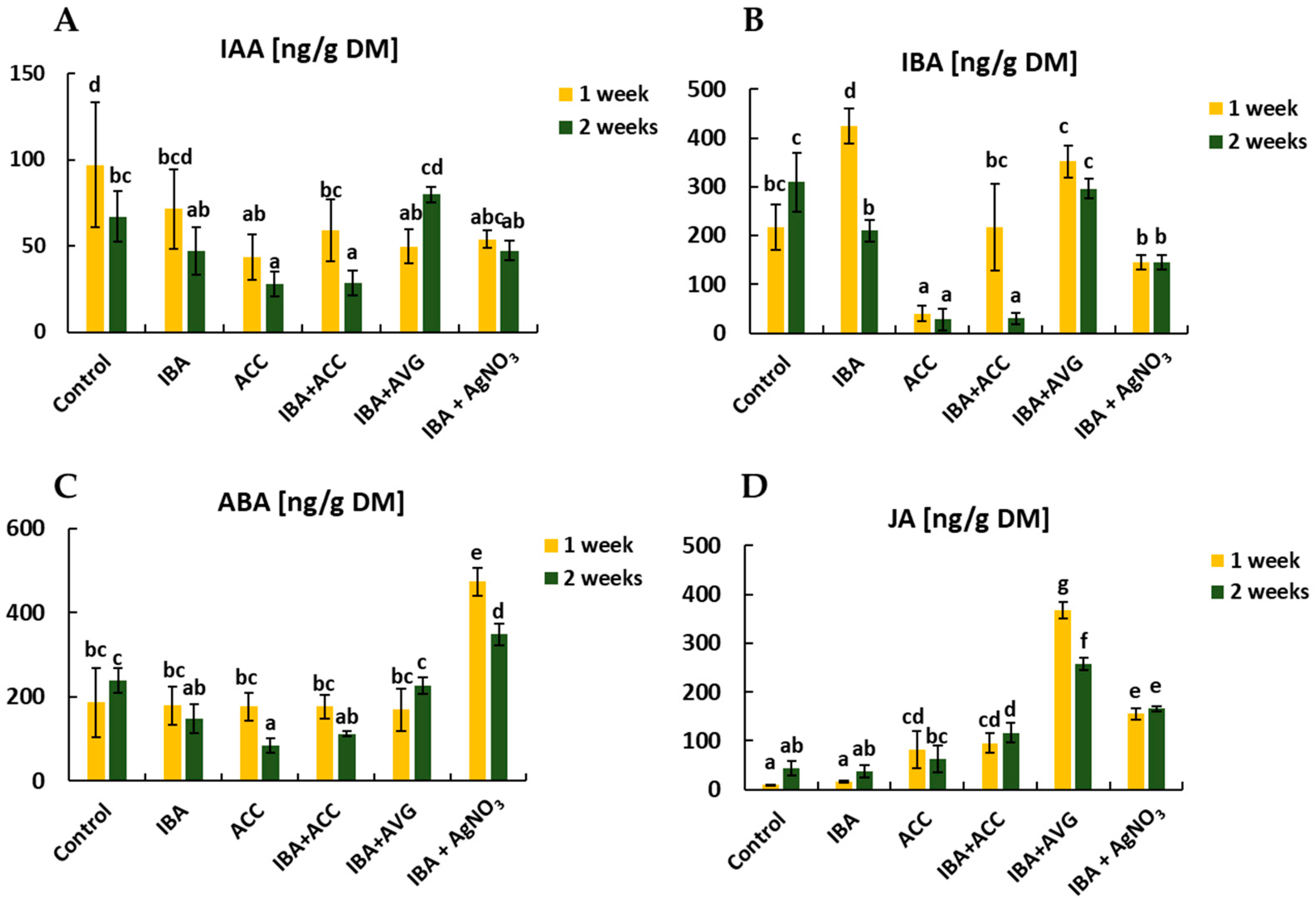 Figure 4. Changes in the content of endogenous hormones (ng·g−1 dry mass) in the rhubarb ‘Raspberry’ selection in weeks one and two of the rooting period (A—IAA content; B—IBA content; C—ABA content; D—JA content). Bars represent means ± SE; values marked with the same letter within each endogenous hormone do not differ significantly according to Duncan’s test (p ≤ 0.05) (n = 3).