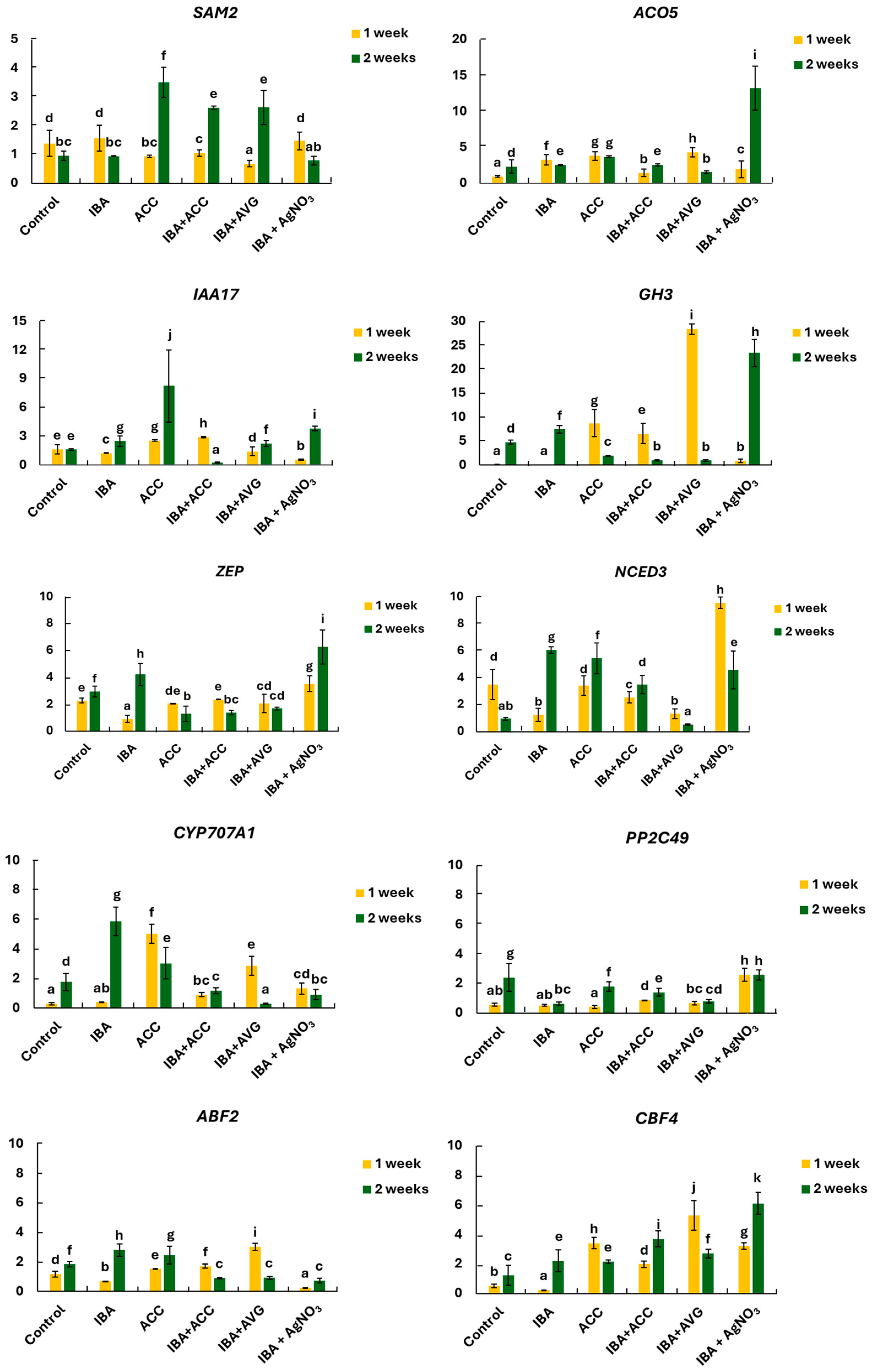 Figure 5. The relative expression of the genes involved in ethylene, auxin, and abscisic acid metabolism in rhubarb ‘Raspberry’. According to Duncan’s test (p = 0.05), means marked with the same letter do not differ significantly (p = 0.05). Error bars represent standard deviation.