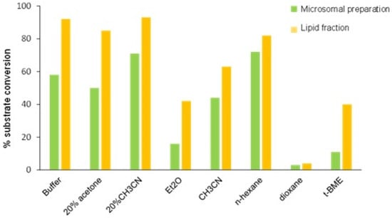 Considering that the LF was separated by treatment with diethyl ether, one might expect that the catalytic activity would be retained and displayed in pure organic solvents. Some organic solvents with different polarity were then considered as reaction medium, and in all the cases, higher conversion of 1 was detected in reactions catalyzed by LF compared to MP. This result seems to suggest a role of the lipid matrix in enhancing the solubilization of the enzyme in the reaction medium and/or protecting it from potential denaturation induced by the organic solvent.