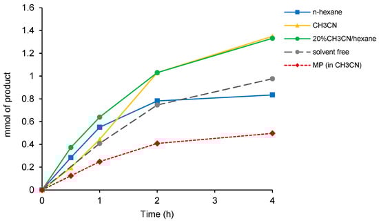 For the sake of comparison, a parallel reaction in CH3CN was carried out using MP as biocatalyst, and a sensibly reduced reaction rate, coupled to incomplete substrate conversion even after a long time, was observed. This finding seems to indicate that peroxygenase in microsomes is more susceptible to peroxide-induced deactivation compared to the same enzyme entrapped in lipid matrix.
