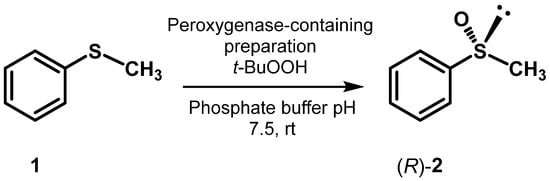 18]. The same reaction with a peroxygenase from lipid droplets has been reported only with the purified enzyme, and the alternative use of a crude lipid fraction might be hampered by the presence of triglycerides in the matrix, which themselves can undergo epoxidation and compete with the substrate. While competitive epoxidation of triglycerides does not pose issues in the sulfoxidation reaction, which occurs at a much higher rate [