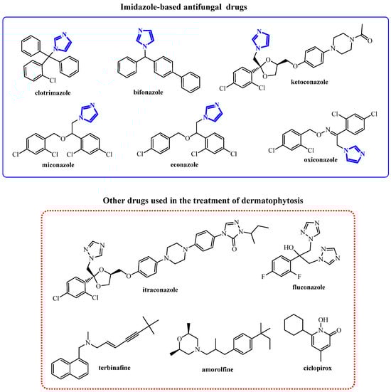 From a clinical perspective, dermatophyte infections are classified according to the anatomical site affected. Onychomycosis (tinea unguium; fungal nail infection) is typically the most difficult form to cure, followed by tinea capitis. Tinea pedis (commonly known as “athlete’s foot”), in turn, is the most common with a prevalence of ~3% in the general population [12], but is substantially higher in specific high-risk groups (e.g., patients with diabetes, athletes, soldiers) [13], whereas tinea corporis (fungal infection of the body) and tinea cruris (superficial fungal infection of the groin and buttocks region) are reported less frequently. Although most dermatophyte infections are not life-threatening and respond well to standard topical therapy, some require prolonged and complex regimens, including combined topical and systemic treatment [14,15]. Topical treatments typically include imidazole-based drugs (e.g., clotrimazole, ketoconazole, miconazole) or allylamines (e.g., terbinafine, naftifine); in addition to ciclopirox or amorolfine which are used especially for nail diseases [14,16,17]. In systemic therapy, in turn, oral antifungal drugs like fluconazole, itraconazole, and terbinafine are widely used [18] (Figure 1).