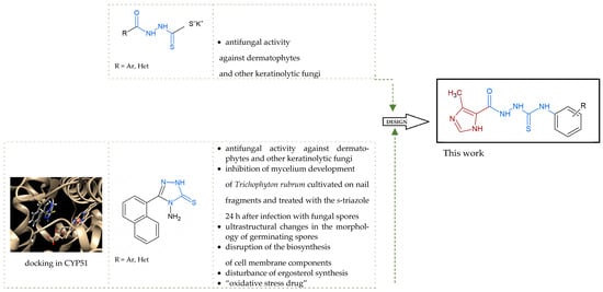 With the hypothesis that the introduction of the imidazole moiety into the thiosemicarbazide scaffold as privileged substructure could be exploited for system optimization, series of known anti-Toxoplasma gondii compounds with an imidazole-thiosemicarbazide scaffold (IMI-TSCs) [28,29] were resynthesized and validated as a pharmacophore for antifungal activity against dermatophytes (Figure 2). The initial screening indicated that some of them are promising candidates. In silico studies confirmed that these compounds have the potential to interact with both α-keratin and lanosterol-14-α demethylase (CYP51), which is consistent with the initial design.