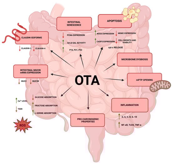 OTA toxicity in the intestines. Abbreviations: CASP3: caspase 3; cyt-c: cytochrome c; IL-6, IL-8, IL-10: interleukins; MDM2: murine double minute 2; mPTP: mitochondrial permeability transition pore; MUC2, MUC5B: mucin encoding genes; NF-κB: nuclear factor κ B; OTA: ochratoxin A; PCNA: proliferating cell nuclear antigen; P16, P21, P53: senescence-associated proteins; ROS: reactive oxygen species; SA-β-gal: senescence-associated β-galactosidase; TEER: transepithelial electrical resistance; TNF-α: tumor necrosis factor α; TLR4: toll-like receptor 4. Created in BioRender. Bijak, M. (2025) https://BioRender.com/skknjie (accessed on 27 August 2025).