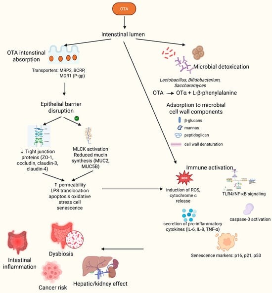 Mechanistic diagram of ochratoxin A (OTA) interactions within the intestine. After ingestion, OTA reaches the intestinal lumen, where it follows several parallel pathways. Intestinal absorption occurs through enterocytes and is modulated by efflux transporters such as MRP2, BCRP, and MDR1 (P-gp). Once absorbed, OTA binds strongly to serum albumin and undergoes enterohepatic recirculation, contributing to its systemic distribution. Microbial detoxification takes place via enzymatic hydrolysis by Lactobacillus, Bifidobacterium, and Saccharomyces species, converting OTA into the non-toxic metabolite ochratoxin α (OTα) and L-β-phenylalanine. In parallel, OTA can be adsorbed to microbial cell wall components (β-glucans, mannans, peptidoglycans), a process enhanced by cell wall denaturation. Epithelial barrier disruption is induced by OTA via downregulation of tight junction proteins (ZO-1, occludin, claudin-3/-4), activation of MLCK, resulting in increased intestinal permeability, LPS translocation, apoptosis, oxidative stress, and cellular senescence. Immune activation involves induction of ROS, cytochrome c release, caspase-3 activation, and upregulation of inflammatory signaling pathways (TLR4/NF-κB), leading to secretion of cytokines such as IL-6, IL-8, and TNF-α. (v) These mechanisms culminate in systemic outcomes, including intestinal inflammation, microbiota dysbiosis, hepatic and renal injury via the gut–liver/kidney axis, and potential cancer risk through chronic inflammation and oxidative DNA damage. Abbreviations: BCRP: breast cancer resistance protein; IL: interleukin; LPS: lipopolysaccharide; MDR1: Multidrug Resistance Protein 1; MLCK: myosin light chain kinase; MRP2: multidrug resistance-associated protein 2; NF-κB: nuclear factor kappa B; OTA: ochratoxin A; OTα: ochratoxin α; P-gp: glycoprotein P; ROS: reactive oxygen species; TLR4: toll-like receptor 4; TNF-α: tumor necrosis factor α; ZO-1: zonula occludens-1. Created in BioRender. Bijak, M. (2025) https://biorender.com/20neuth (accessed on 24 September 2025).