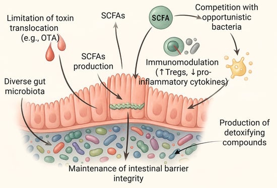 The intestines that come into contact with OTA as a result of its extensive metabolism are subject to its toxic effects [26,27,28]. Additionally, when discussing the intestines as an organ, attention should also be given to the microbiome. Its definition refers to the set of genes of microorganisms found in the human body [29,30]. The human microbiome is mostly present in the gastrointestinal tract (GIT), and its important role is to influence the development, functioning, and homeostasis of the GIT, as well as its integration with the host’s immune and nervous systems [31].