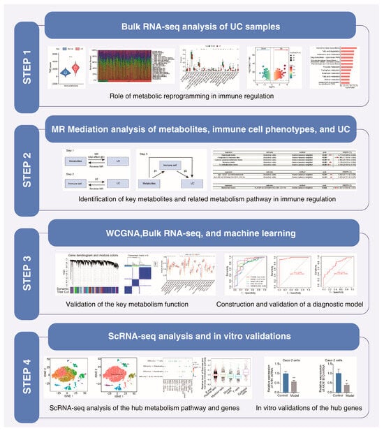 Although observational and experimental studies have shown that metabolism dysregulation is a key driver of immune dysregulation, establishing definitive causal associations among metabolism, the immune response, and the pathological processes of UC remains challenging due to methodological limitations. In this study, we revealed marked immune dysregulation and metabolic disorders using transcriptomic data from UC patients. Importantly, we also conducted Mendelian randomization (MR) analysis to draw causal connections among metabolites, immune phenotypes, and UC risk. Furthermore, using the metabolites and metabolism genes found to be involved in immune regulation and UC progression, we constructed a machine learning model that showed significant value in disease diagnosis. Single-cell analysis further revealed the relationship between metabolic gene expression and the immune response. Finally, the experimental results verified the expression of key metabolism genes (Figure 1). This study aimed to explore the key metabolic–immune regulatory changes in UC, contributing to the elucidation of disease mechanisms and the development of novel diagnostic and therapeutic measures.