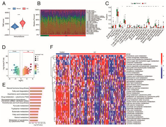 Immune abnormalities and metabolic programming involved in the pathological processes of UC. (A) Immune score of UC and normal samples (GSE87466). (B) Bar plot showing the proportion of infiltrating immune cells in the UC and normal control groups. (C) Boxplot concerning the differences in abundance of immune cells between the groups. (D) Volcano plot of DEGs between the UC and normal control groups. (E) KEGG analysis of the UC-related DEGs. (F) Heatmap of metabolic pathways between the groups. *, p < 0.05; **, p < 0.01; ***, p < 0.001.