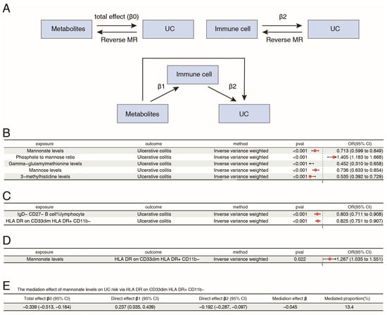 Mendelian randomization of associations between metabolites, immune cell phenotypes, and UC. (A) The flowchart of Mendelian randomization mediation study. (B) Forest plot of the causal relationship between metabolites and UC risk. (C) Forest plot of the causal relationship between immune cell phenotypes and UC risk. (D) Forest plot of the causal relationship between identified metabolites and immune cell phenotypes. (E) The mediation effect of mannonate levels on UC risk via HLA DR on CD33dim HLA DR+ CD11b−.