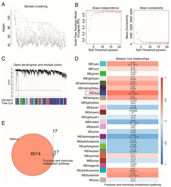 Identification of hub genes in UC using WGCNA. (A) Hierarchical clustering trees of mRNAs expression patterns in UC samples (GSE87466). (B) Topological calculations with soft thresholds value (1~20) to select the optimal soft threshold. (C) Clustering dendrograms of genes in UC. (D) Heatmap of the correlation analysis of module eigengenes with the fructose and mannose metabolism pathway(the MEblue module contains the genes that are the most strongly correlated with this pathway). (E) Venn diagrams for intersecting genes between coexpressed module genes and genes in the metabolism pathway.