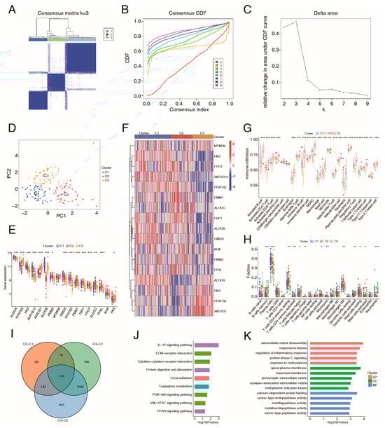Consensus cluster analysis of the mannose metabolism-related genes in UC. (A) Consensus clustering matrix for UC (k = 3). (B) CDF plot from the consensus clustering analysis. (C) Delta area plot of consensus clustering. (D) PCA analysis showing the distribution of three gene clusters identified by consensus clustering. (E,F) Boxplot (E) and heatmap (F) of mannose metabolism-related gene expression in the three subgroups. (G) Boxplot of immuno-related function enrichment based on ssGSEA analysis. (H) Boxplot showing the proportion of infiltrating immune cells in the three subgroups. (I) Venn diagrams for intersecting differentially expressed genes across the three subgroups. (J) KEGG analysis of the differentially expressed genes. (K) GO analysis of the differentially expressed genes. *, p < 0.05; **, p < 0.01; ***, p < 0.001.