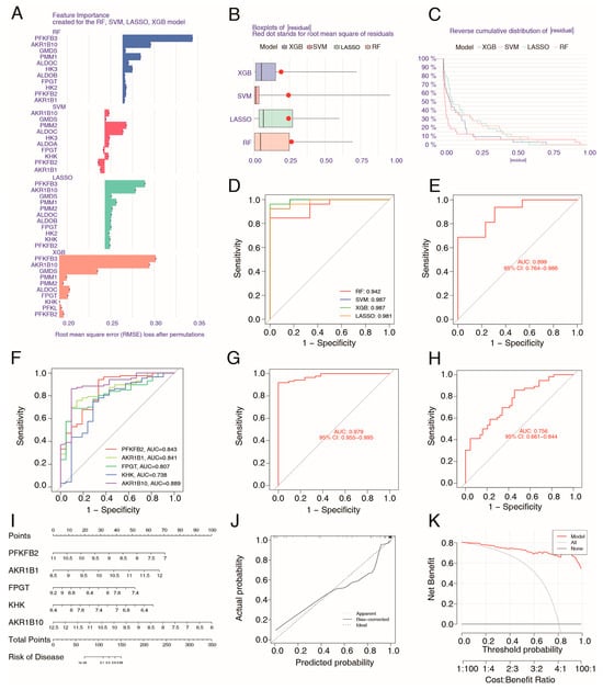 Construction and verification of a metabolism-related diagnostic model for UC patients via machine learning. (A) The importance of variables in each machine learning model. (B) Box plots of residual of each machine learning model. (C) Reverse cumulative distribution of residual showing the residual distribution. (D) ROC curves of these four models based on the 17 metabolism genes (training set). (E) ROC curves of the SVM model based on the 17 metabolism genes (validation set). (F) ROC curves of the SVM model based on each of the top five genes (training set). (G) ROC curves of SVM model based on the total of top five genes (training set). (H) ROC curves of SVM model using the top five genes (validation set). (I) A nomogram that predicts UC risk based on a five-gene SVM model. (J,K) Calibration (J) and DCA (K) curve of the nomogram model using the top five metabolism genes.