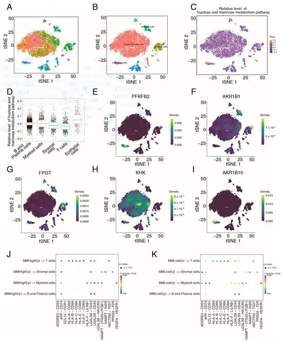 ScRNA-seq analysis of the metabolism genes. (A) t-SNE plot displaying 17 subgroups after dimension reduction (GSE214695). (B) t-SNE plot showing annotated cell categories. (C,D) t-SNE plot (C) and box plot (D) displaying the activation level of the fructose and mannose metabolism pathway in various types of cells. (E–I) t-SNE plots showing the distribution of the metabolism genes. (J) Single-cell ligand-receptor analysis showing intercell communications between epithelial cells with activation of fructose and mannose metabolism pathway (MM High Epi) and other cells. (K) Single-cell ligand-receptor analysis showing intercell communications between epithelial cells with inactivation of fructose and mannose metabolism pathway (MM Low Epi) and other cells.