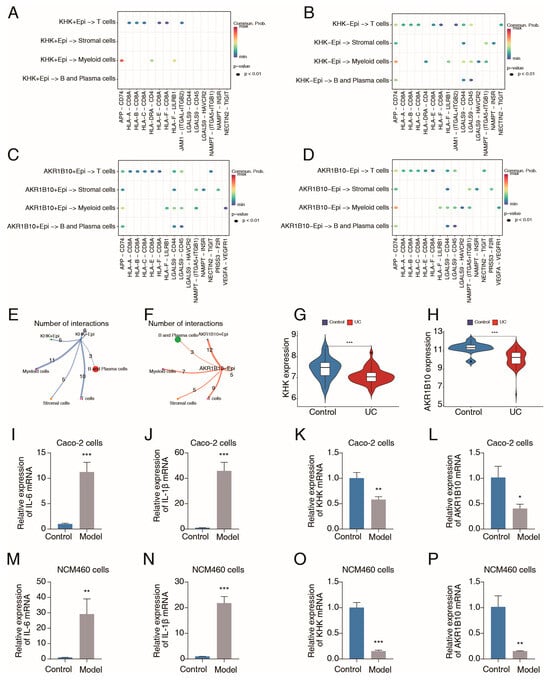 scRNA-seq analysis of the gene function and validation of metabolism gene expression in inflammatory colon epithelial cells. (A,B) Single-cell ligand-receptor analysis showing intercell communications between epithelial cells with high or low expression of KHK (KHK+ or KHK− Epi) and other cells. (C,D) Single-cell ligand-receptor analysis showing intercell communications between epithelial cells with high or low expression of AKR1B10 (AKR1B10+ or AKR1B10− Epi) and other cells. (E,F) Global intercellular communication among subsets based on number of interactions. (G,H) Violin plots of KHK (G) and AKR1B10 (H) expression in normal colon samples and UC patient tissues in the GSE87466 dataset. (I,J) qRT-PCR analysis of IL-6 (A) and IL-1β (B) mRNA expression in normal Caco-2 cells and Caco-2 cells following the TNF-α stimulation (model) (n = 3). (K,L) qRT-PCR analysis of KHK (C) and AKR1B10 (D) mRNA expression in normal and model Caco-2 cells (n = 3). (M,N) qRT-PCR analysis of IL-6 (E) and IL-1β (F) mRNA expression in normal NCM460 cells and NCM460 cells following the TNF-α stimulation (model) (n = 3). (O,P) qRT-PCR analysis of KHK (G) and AKR1B10 (H) mRNA expression in normal and model NCM460 cells (n = 3). Data are shown as the mean ± SD (*, p < 0.05; **, p < 0.01; ***, p < 0.001).
