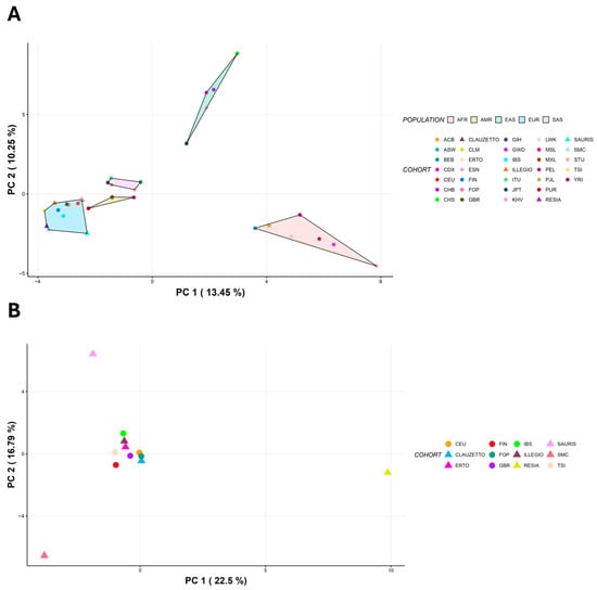 Principal Component Analysis (PCA) based on CYP2D6 alleles frequencies. (A) PCA clustering FIC, FOP, and populations from 1 KG. FIC and FOP cluster with European populations as expected. (B) PCA on European populations. Resia, SMC, and Sauris cluster independently from other European populations. (ACB: African Caribbean in Barbados; ASW: African Ancestry in Southwest US; BEB: Bengali in Bangladesh; CDX: Chinese Dai in Xishuangbanna, China; CEU: Utah residents with Northern and Western European ancestry; CHB: Han Chinese in Beijing, China; CHS: Southern Han Chinese, China; CLAUZETTO: Clauzetto, FIC; CLM: Colombian in Medellin, Colombia; ERTO: Erto, FIC; ESN: Esan in Nigeria; FIN: Finnish in Finland; FOP: FVG outbred population; GBR: British in England and Scotland; GIH: Gujarati Indian in Houston, Texas; GWD: Gambian in Western Division, The Gambia; IBS: Iberian populations in Spain; ILLEGIO: Illegio, FIC; ITU: Indian Telugu in the United Kingdom; JPT: Japanese in Tokyo, Japan; KHV: Kinh in Ho Chi Minh City, Vietnam; LWK: Luhya in Webuye, Kenya; MSL: Mende in Sierra Leone; MXL: Mexican Ancestry in Los Angeles, California; PEL: Peruvian in Lima, Peru; PJL: Punjabi in Lahore, Pakistan; PUR: Puerto Rican in Puerto Rico; RESIA: Resia, FIC; SAURIS: Sauris, FIC; SMC: San Martino del Carso, FIC; STU: Sri Lankan Tamil in the United Kingdom; TSI: Toscani in Italy; YRI: Yoruba in Ibadan, Nigeria).