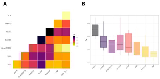 - Goudet, J. HIERFSTAT, a Package for R to Compute and Test Hierarchical F-Statistics. Mol. Ecol. Notes 2005, 5, 184–186. [Google Scholar] [CrossRef]