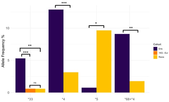 To investigate differences in CYP2D6 allele frequencies between FIC and control populations, a Kruskal–Wallis test was initially carried out, highlighting statistically significant differences among FIC, FOP, and 1 KG-Eur (p = 0.0005). Then, a Dunn test was conducted as a post hoc test to pinpoint significantly different groups, highlighting differences in CYP2D6 allele frequencies between Erto and Resia (p = 0.04), and between Erto and 1 KG-Eur (p = 0.01). In particular, the differentially abundant alleles between Erto and Resia were CYP2D6*33 (p = 0.006), CYP2D6*4 (p = 0.0002), CYP2D6*68+*4 (p = 0.001), and CYP2D6*5 (p = 0.01), while only CYP2D6*33 was significantly different between Erto and 1 KG-Eur (p = 0.0004) (Figure 3).