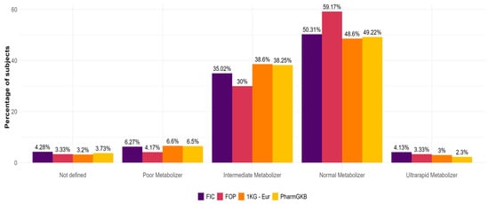 Moreover, it was possible to define the metabolizer status for 628 individuals from FIC (95.7%), 116 subjects from FOP (96.7%), and 484 subjects from the 1 KG-Eur cohort (96.8%). The other individuals (28 from FIC, four from FOP, and 16 from the 1 KG-Eur cohort) carried alleles with unknown effects, and the metabolizer status could not be defined. Subsequently, the distribution of metabolizer classes (i.e., Ultrarapid Metabolizer -UM-, Normal Metabolizers -NM-, Intermediate Metabolizers -IM-, and Poor Metabolizers -PM-) in the different populations were compared through a proportion test using PharmGKB as reference, and no significant differences were observed (Figure 4).