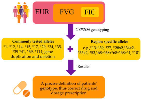 Results summary. The FIC population was sampled to obtain novel insight into the CYP2D6 alleles distribution in the population from the FVG Italian region (European ancestry). By expanding the tests to include region-specific alleles in FVG (e.g., those uniquely identified in FIC with a known function, and the *28x2 allele, which appears to be more frequent in this population), it would be possible to implement personalized medicine in this population. EUR: Europeans; FVG: Friuli-Venezia Giulia Region; FIC: FVG isolated communities.