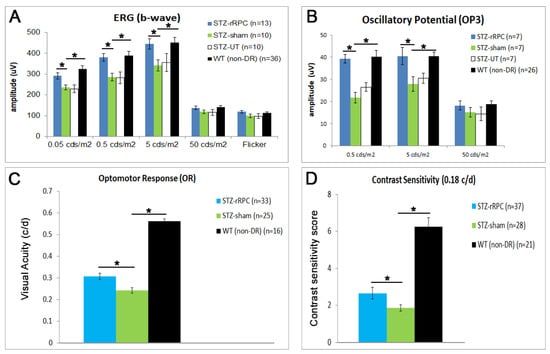 After screening for successful induction via STZ, animals were randomized to a treatment group. In addition to un-induced wild-type (WT, non-DR), the groups were STZ untreated (STZ-UT), STZ sham-treated (STZ-sham), STZ rat RPC-treated (STZ-rRPC), and STZ human RPC-treated (STZ-hRPC). All functional testing was performed with the tester blind to treatment group.