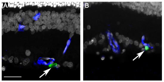 Immunohistochemical analysis of STZ-induced DR retinas after rRPC treatment (STZ-rRPC) (A,B). Isolectin B4 (blue) labels blood vessels, while E1A (green) is an endogenous reporter that labels donor rRPCs (arrows). Here, we see association of rRPCs with vessels in the inner retina. Representative examples selected from total animal number (n = 12). Scale bar = 50 µm (applicable to (A,B)).