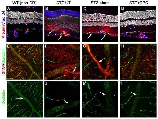 Immunohistochemical analysis of wild-type (WT) and STZ-induced DR retinas (STZ-UT), with comparison to STZ-sham and STZ-rRPC-treated examples. Lack of albumin (red) extravasation (arrows) shows that rRPCs (far right) resist blood retinal barrier breakdown (A–D). GFAP (red) shows fewer disorganized Muller cells and astrocytes (arrows) in rRPC-treated eyes vs. STZ controls (E–H). Occludin (green) shows improved vascular tight junctions (arrows) in rRPC-treated vs. STZ controls (I–L). Representative examples selected from animal groups of number n = 7 (WT), 5 (STZ-UT), 10 (STZ-sham), 12 (STZ-rRPC), respectively. Scale bar = 50 µm (applicable throughout, (A–L)).