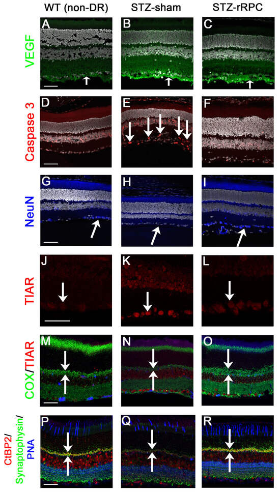 Immunohistochemical analysis of wild-type (WT) and STZ-sham with comparison to STZ-rRPC examples. VEGF (green, arrows) is associated with retinal ischemia and is low in WT (A) and elevated in STZ retinas, as seen in STZ-sham (B), but less so in rRPC-treated eyes (C). Caspase 3 (red) is absent from WT (D) but clearly labels apoptotic retinal ganglion cells in STZ retina ((E), arrows), while markedly diminished with rRPC treatment (F). NeuN (blue) labeling of neurons in the GCL. In STZ-sham eyes, NeuN is decreased (H) vs. non-STZ (WT, (G)), but not in cell-treated STZ eyes (I), indicating neuroprotection. TIAR (red) moves from the nucleus to the cytoplasm into stress granules under stressful conditions. It is elevated in shams (K) compared to rRPC-treated eyes (L). COX (green) labels mitochondria in the photoreceptor synaptic terminals. COX in the OPL is much stronger in WT (M) and rRPC-treated eyes (O) vs. shams (N), indicating neuroprotection. Synaptophysin (green) labels synaptic vesicles, CtbP2 (red) labels synaptic ribbons, and PNA (blue) labels cones. All are strongly expressed in WT (P), diminished in STZ-sham (Q), but preserved in rRPC-treated retinas (R), indicating neuroprotection. Representative examples selected from animal groups of number n = 7 (WT), 10 (STZ-sham), and 12 (STZ-rRPC), respectively. Scale bars = 50 µm throughout (note: magnification is higher for (J–L), scale bar is longer).