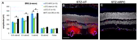 Human RPC xenografts in STZ rats. (A) ERG: b-wave amplitude in hRPC-treated (blue) is rescued vs. sham (green) and untreated (white), with WT in black. Significant improvement for cell vs. sham at 5 cds/m2. Indicated n counts refer to number of eyes. * p < 0.05 (Student’s t-test, unpaired, two-tailed). (B) Diffuse albumin leakage (red) in STZ-UT. (C) Lack of albumin extravasation from intact intraretinal vessels in STZ-hRPC-treated animal. Representative examples selected from animal groups numbering n = 5 (STZ-UT) and 6 (STZ-hRPC), respectively. Scale bar = 50 µm (applicable to (B,C)).