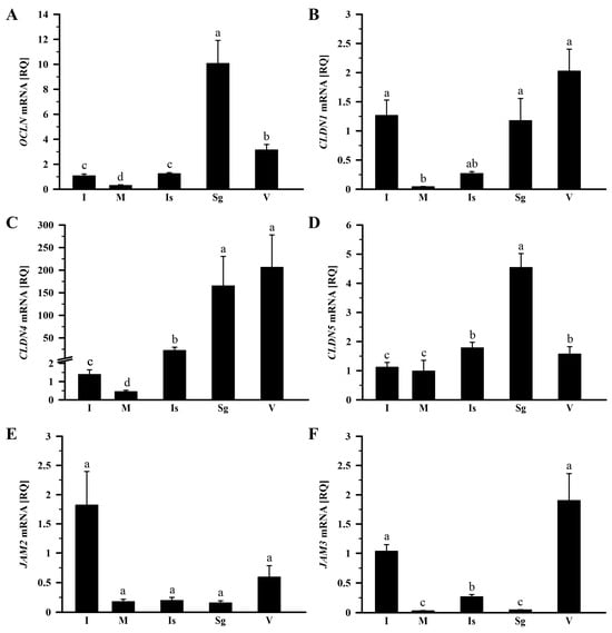 Relative gene expression of OCLN (A), CLDN1 (B), CLDN4 (C), CLDN5 (D), JAM2 (E), and JAM3 (F) in the oviduct of the control (laying) hens. Each value represents the mean relative quantity (RQ) ± standard error of the mean (SEM) from five or six different hens, normalized to 18S rRNA expression and standardized to the expression in the infundibulum. Values labeled with different letters differ significantly (p < 0.05; Kruskal–Wallis test followed by the Student–Newman–Keuls test). Abbreviations: OCLN, occludin; CLDN, claudin; JAM, junctional adhesion molecule; I, infundibulum; M, magnum; Is, isthmus; Sg, shell gland; V, vagina.