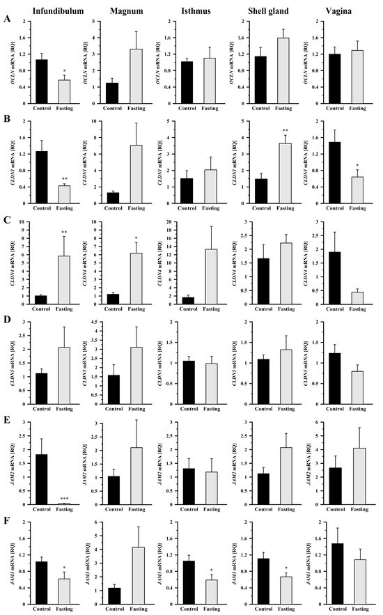 Relative gene expression of OCLN (A), CLDN1 (B), CLDN4 (C), CLDN5 (D), JAM2 (E), and JAM3 (F) in the oviductal segments of the control and fasted hens evaluated by qRT-PCR. Each value represents the mean relative quantity (RQ) ± SEM from five or six different hens normalized to 18S rRNA and standardized to the expression in the section of the control hens. * p < 0.05, ** p < 0.01—compared to the control tissue (Mann–Whitney U test). Abbreviations as in Figure 1.