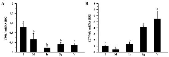 Relative gene expression of CDH1 (A) and CTNNB1 (B) in the oviduct of the control (laying) hens. Each value represents the mean relative quantity (RQ) ± SEM from five or six different hens, normalized to 18S rRNA expression and standardized to the expression in the infundibulum. Values labeled with different letters differ significantly (p < 0.05; Kruskal–Wallis test followed by the Student–Newman–Keuls test). Abbreviations: CDH1, cadherin-1; CTNNB1, catenin beta-1 (also known as β-catenin). Other abbreviations as in Figure 1.