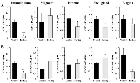 Relative gene expression of CDH1 (A) and CTNNB1 (B) in the oviductal segments of the control and fasted hens evaluated by qRT-PCR. Each value represents the mean relative quantity (RQ) ± SEM from five or six different hens normalized to 18S rRNA and standardized to the expression in the section of the control hens. * p < 0.05, ** p < 0.01, *** p < 0.001—compared to the control tissue (Mann–Whitney U test). Abbreviations as in Figure 3.