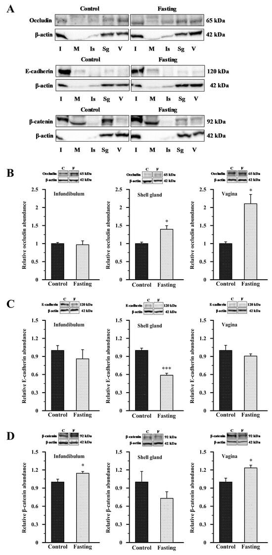 Owing to the limited availability of commercial antibodies for chicken cell–cell junction proteins, we were only able to determine the presence of occludin, E-cadherin, and β-catenin protein in different segments of the chicken oviduct using Western blot (Figure 5). In all oviductual sections, both from control and fasted hens, bands corresponding to molecular weights of approximately 65 kDa, 120 kDa, and 92 kDa were detected for occludin, E-cadherin, and β-catenin, respectively (Figure 5A). Due to the low or undetectable abundance of β-actin in the magnum and isthmus, these segments were excluded from further densitometric analysis. Quantitative analysis of occludin, E-cadherin, and β-catenin protein abundance was conducted in the infundibulum, shell gland, and vagina of both control and fasted hens. In fasted hens, relative abundance of occludin protein was higher by 39.5% (p < 0.05) in the shell gland and by 110.5% (p < 0.05) in the vagina, compared to control hens (Figure 5B). The abundance of E-cadherin protein was lower by 41.3% (p < 0.001) in the shell gland of fasted hens than in control hens (Figure 5C). Fasting also induced a 14.4% increase (p < 0.05) in β-catenin protein level in the infundibulum and a 23.4% increase (p < 0.05) in the vagina (Figure 5D).