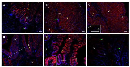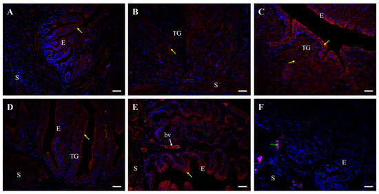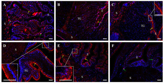 Immunofluorescent localization of β-catenin protein in all parts of the oviduct: infundibulum (A), magnum (B), isthmus (C,C’), shell gland (D), and vagina (E) of control hens. Positive staining (red fluorescence) is marked with yellow arrows. DAPI staining (blue) shows the cell nuclei. Non-specific staining in erythrocytes is indicated by green arrows. Frames in (D,E) indicate the location of a higher magnification view. Strong β-catenin immunopositive signals are detected in the membrane and cytoplasm of cells in the luminal epithelium (E) of the infundibulum and vagina, as well as in tubular glands (TG) of the magnum and isthmus. Moderate positive signals are detected in the luminal epithelium of the magnum, isthmus, and shell gland, as well as in tubular glands of the shell gland, and in stromal muscles (S; muscles + connective tissue) of the magnum. Weak or very weak immunoreactivity is observed in muscles of the infundibulum, isthmus, shell gland, and vagina. (F) A negative control section incubated without the primary antibody did not exhibit specific reactivity. Scale bars = 50 μm.
