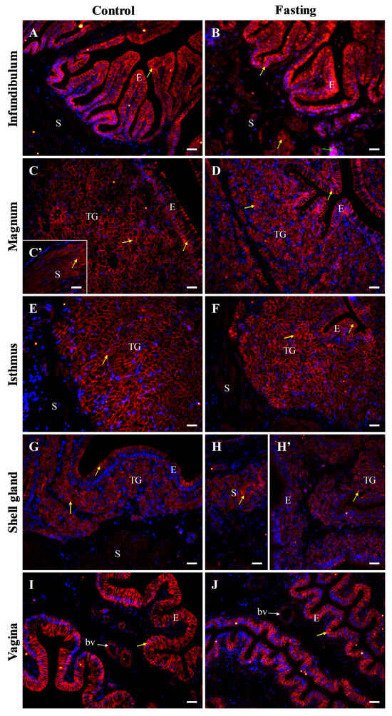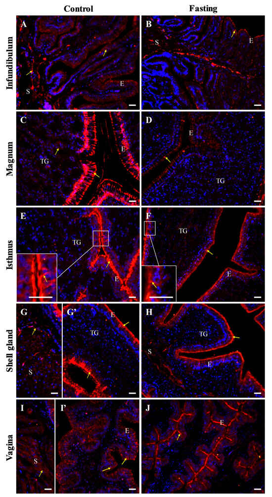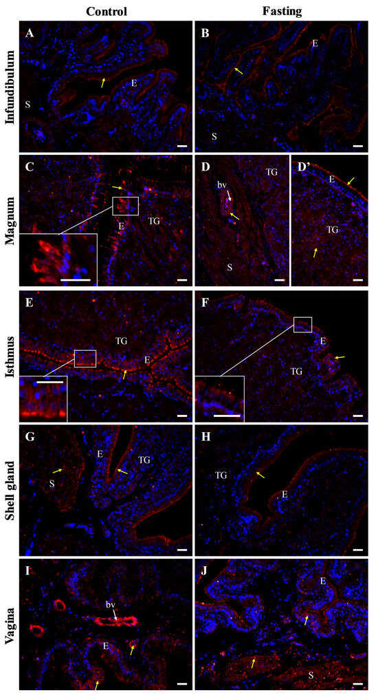 Immunofluorescent localization of E-cadherin protein in oviductal sections of the control (A,C,E,G,G’,I,I’) and fasted (B,D,F,H,J) hens. Positive signals (red) are marked with yellow arrows. DAPI staining (blue) indicates the nuclei. Frames in (E,F) indicate the location of a higher magnification view. It is noteworthy that the immunoreactivity for E-cadherin in the luminal epithelium of the oviduct is reduced in the non-laying hens compared to the control birds, and the staining is more diffused. Abbreviations as in Figure 7. Scale bars = 20 μm.