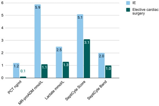 PCT and lactate were incremented in Group 1, but not in Group 2. The median MR-proADM in the infective endocarditis cohort was 5.9 ng/mL versus 1.1 ng/mL in the IE group and the elective cardiac surgery group, respectively.