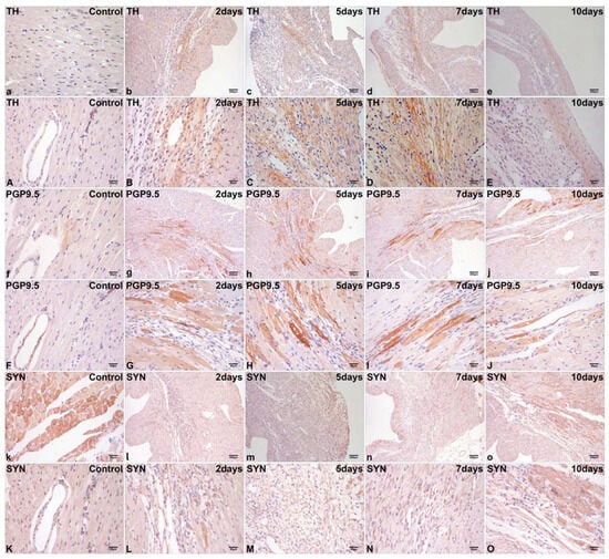 Chicago/Turabian StyleYu, Tianshui, Baoqing Pei, and Dong Zhao. 2025. "Sympathetic Biomarker Dynamics Post-Myocardial Infarction: TH, PGP9.5, and SYN Expression Discordance in Murine Hearts" International Journal of Molecular Sciences 26, no. 19: 9456. https://doi.org/10.3390/ijms26199456
