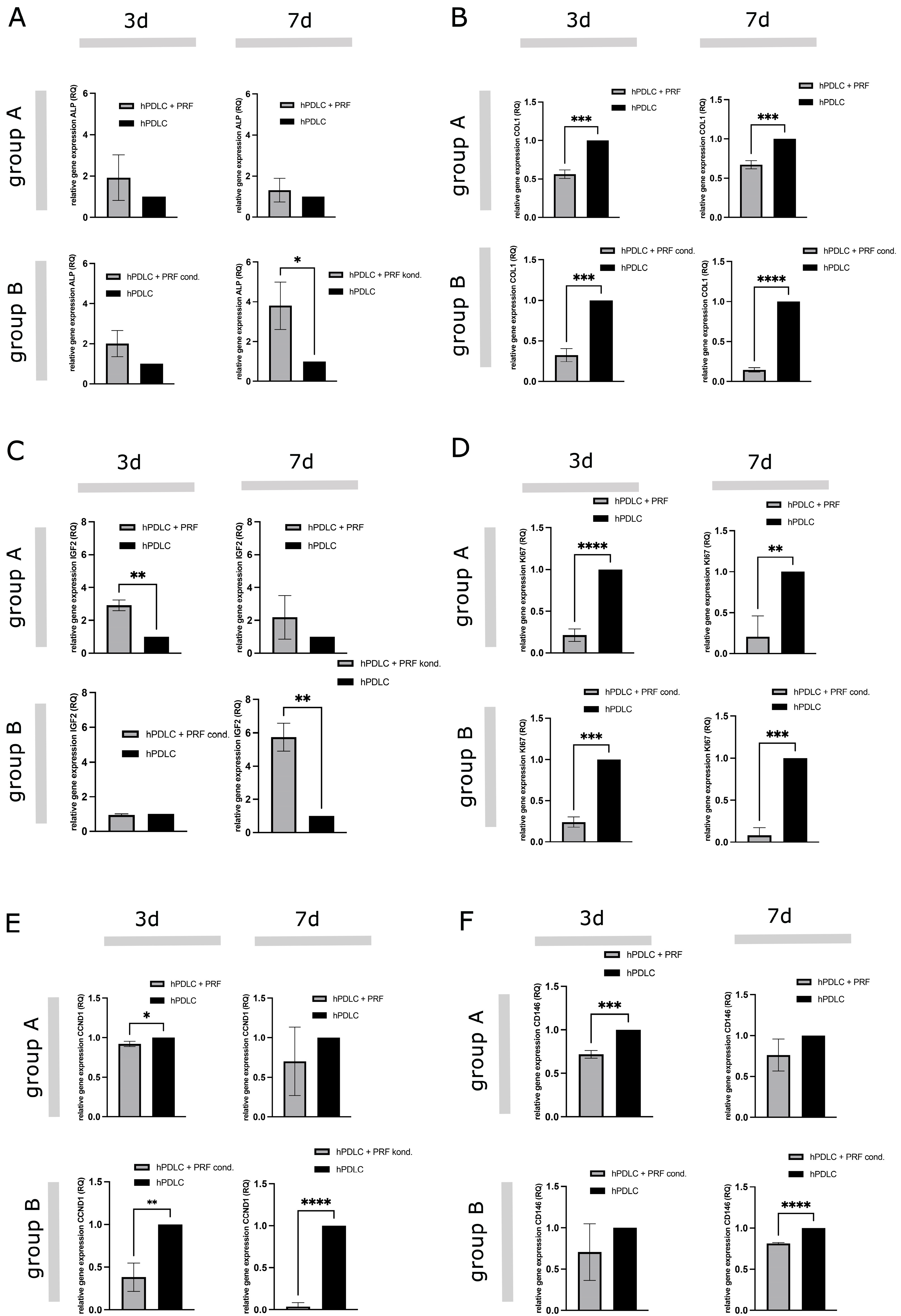 2.2.3. PRF-Mediated Effect on Gene Expression of Differentiation, Proliferation and Stem Cell Associated Markers in hPDLCs