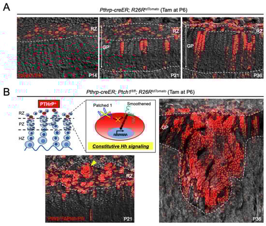 PTHrP+ resting zone chondrocytes are gpSSCs contributing to columnar formation, and Hedgehog signaling activates their osteogenic cell fate. (A) In vivo lineage-tracing of PTHrP+ resting zone chondrocytes using Pthrp-creER; R26RtdTomato bigenic mice injected with tamoxifen at P6 and chased up to P36. (B) Constitutive Hedgehog activation in PTHrP+ resting zone chondrocytes using Pthrp-creER; Ptch1fl/fl; R26RtdTomato trigenic mice injected with tamoxifen at P6 and chased up to P36. RZ: resting zone, GP: growth plate, Red: tdTomato, Gray: DIC, Arrowheads: patched rose. Adapted from Orikasa et al., JCI Insight. 2024;9(2):e165619 [14]. CC-BY-4.0.