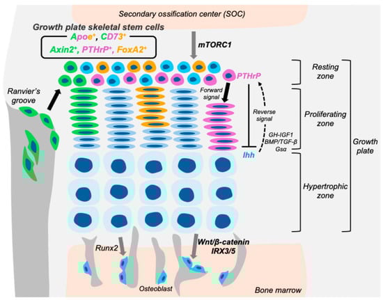 The growth plate is a cartilage tissue located at the end of long bone and contains a specialized population of SSCs that direct longitudinal bone growth through precise cell division and maturation processes. These growth plate skeletal stem cells (gpSSCs) mainly reside in the resting zone, sustaining their stem cell properties through complex interactions with their surrounding microenvironment [9]. Studies have shown that these stem cells develop self-renewal capability and form columns of chondrocytes after the secondary ossification center (SOC) develops in the postnatal stage. The cell population demonstrates essential stem cell characteristics such as self-renewal capability and multipotency, with specific subpopulations identified by parathyroid hormone-related protein (PTHrP), CD73, axis inhibition protein 2 (Axin2), forkhead box protein A2 (FoxA2), and apolipoprotein E (ApoE) expression [6,7,10,11,12]. Through intricate molecular signaling networks and cellular interactions, these stem cells orchestrate skeletal development and tissue function throughout growth periods, controlled by key pathways including Wnt/β-catenin, mammalian target of rapamycin (mTOR), and Hedgehog signaling [6,7,10,13,14,15].