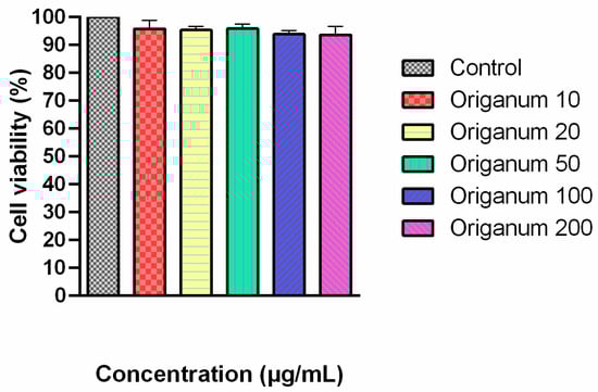 Results from the MTT assay indicate that treatment with O. majorana extract at concentrations ranging from 10 to 200 µg/mL did not significantly affect cell viability compared to the control group (Figure 2). Cell viability remained above 90% at all concentrations tested, indicating that the extract did not exhibit cytotoxic effects in this range. These findings demonstrate that O. majorana extract was well tolerated by the cells under in vitro conditions and can be considered safe for further biological or pharmacological evaluations.