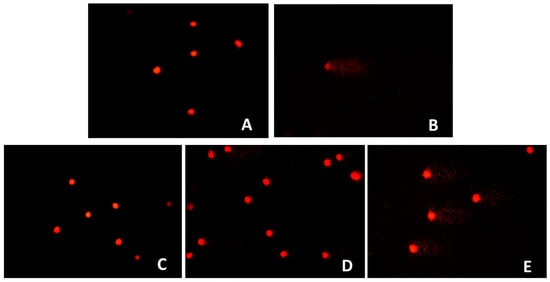 Images of comet assays in fibroblasts subjected to methanolic extracts from O. majorana at 400× magnification. (A) Control, (B) Positive control (50 µM H2O2), (C) O. Majorana extract (10 µg/mL), (D) O. majorana extract (100 µg/mL), (E) O. majorana extract (200 µg/mL).