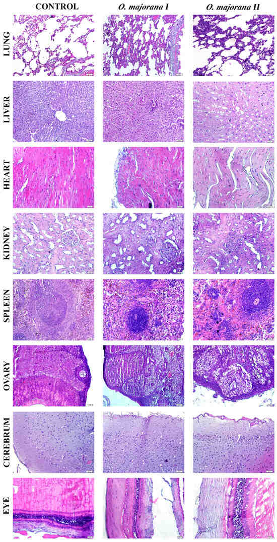Representative micrographs of the lung, liver, heart, kidney, spleen, ovary, cerebrum, and eye tissues from the control (left column), O. majorana I (300 mg/kg; middle column), and O. majorana II (2000 mg/kg; right column) experimental groups. Haematoxylin and eosin (H&E); 20× magnification. The scale bar is 50 µm in all images.