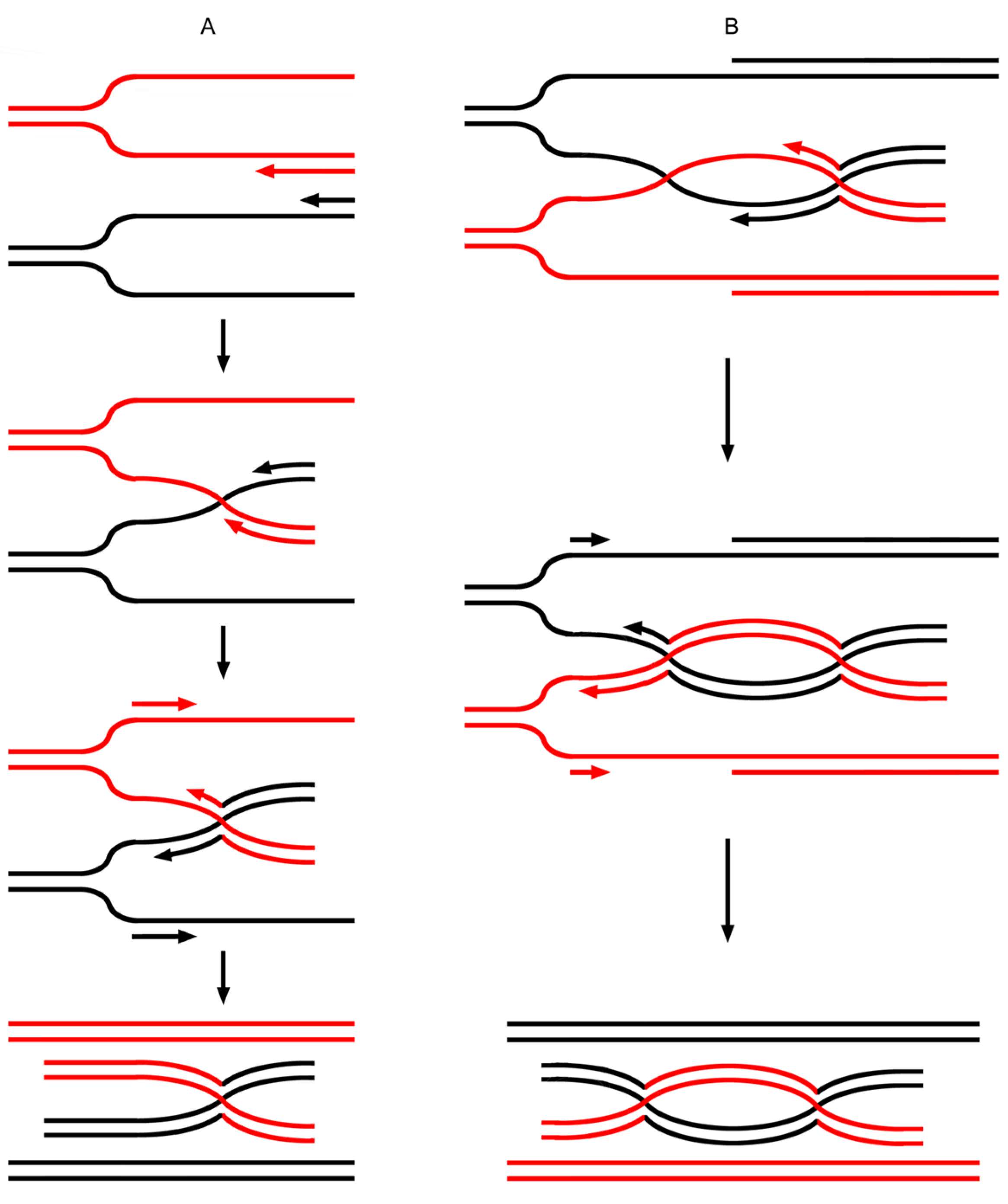 [31,39] | Recombination of short direct repeats might result from DNA replication errors—specifically, the tip of a growing DNA chain could slip between repeats and be utilized as a primer to continue DNA synthesis. | Strongly support that recombination between short direct repeats operates via a copy-choice mechanism, rather than a break/join mechanism. |
